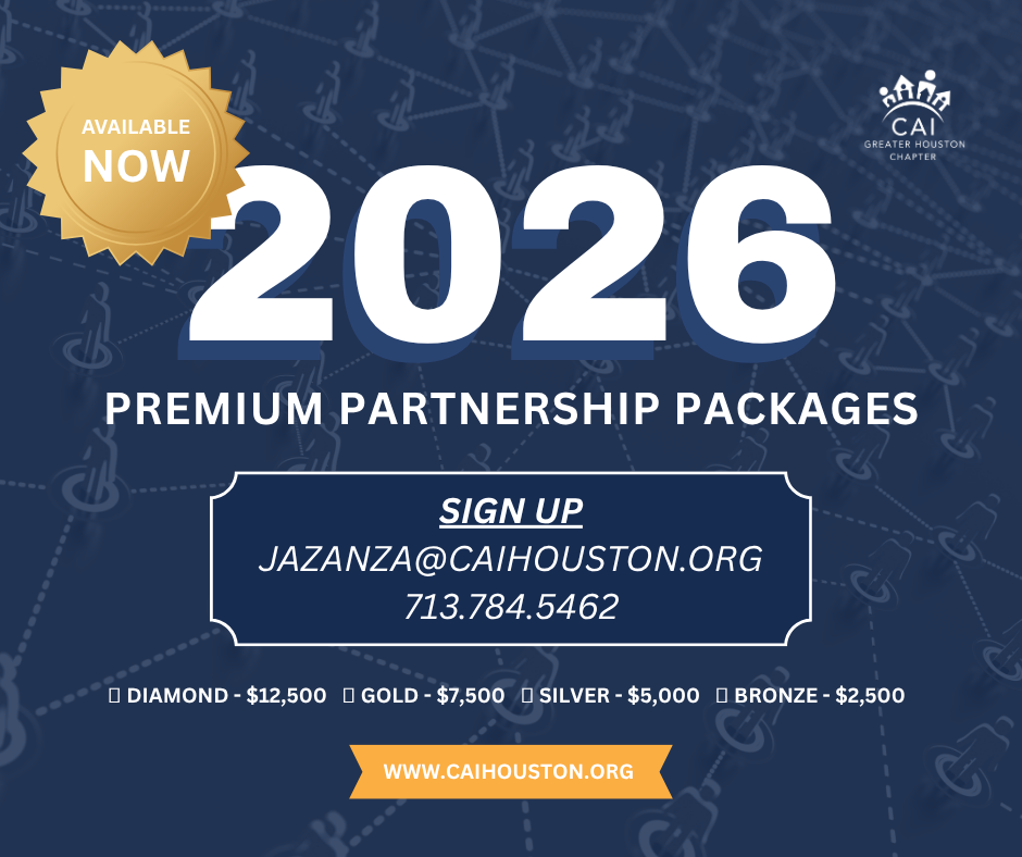 The CAI Greater Houston Chapter is proud to announce our annual sustaining sponsorship packages for 2026 are now available! Support one of the Community Associations Institute's largest Chapter's serving community association board members, managers, management firms, and professionals who provide products and services to community associations.