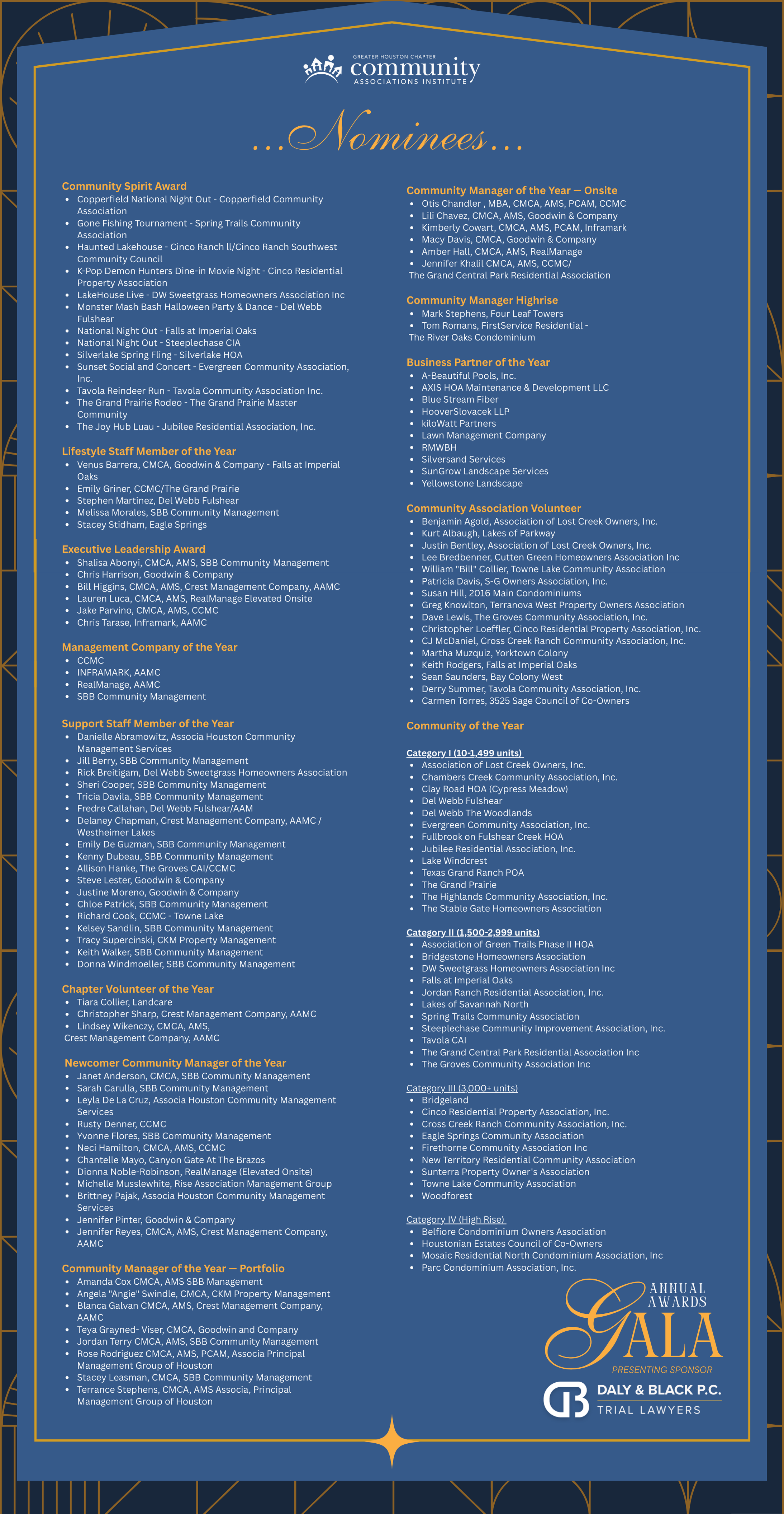 Join us on January 30, 2025, at the Marriott Marquis Houston as we celebrate the outstanding people and organizations that make the CAI Greater Houston Chapter a place where communities shine.